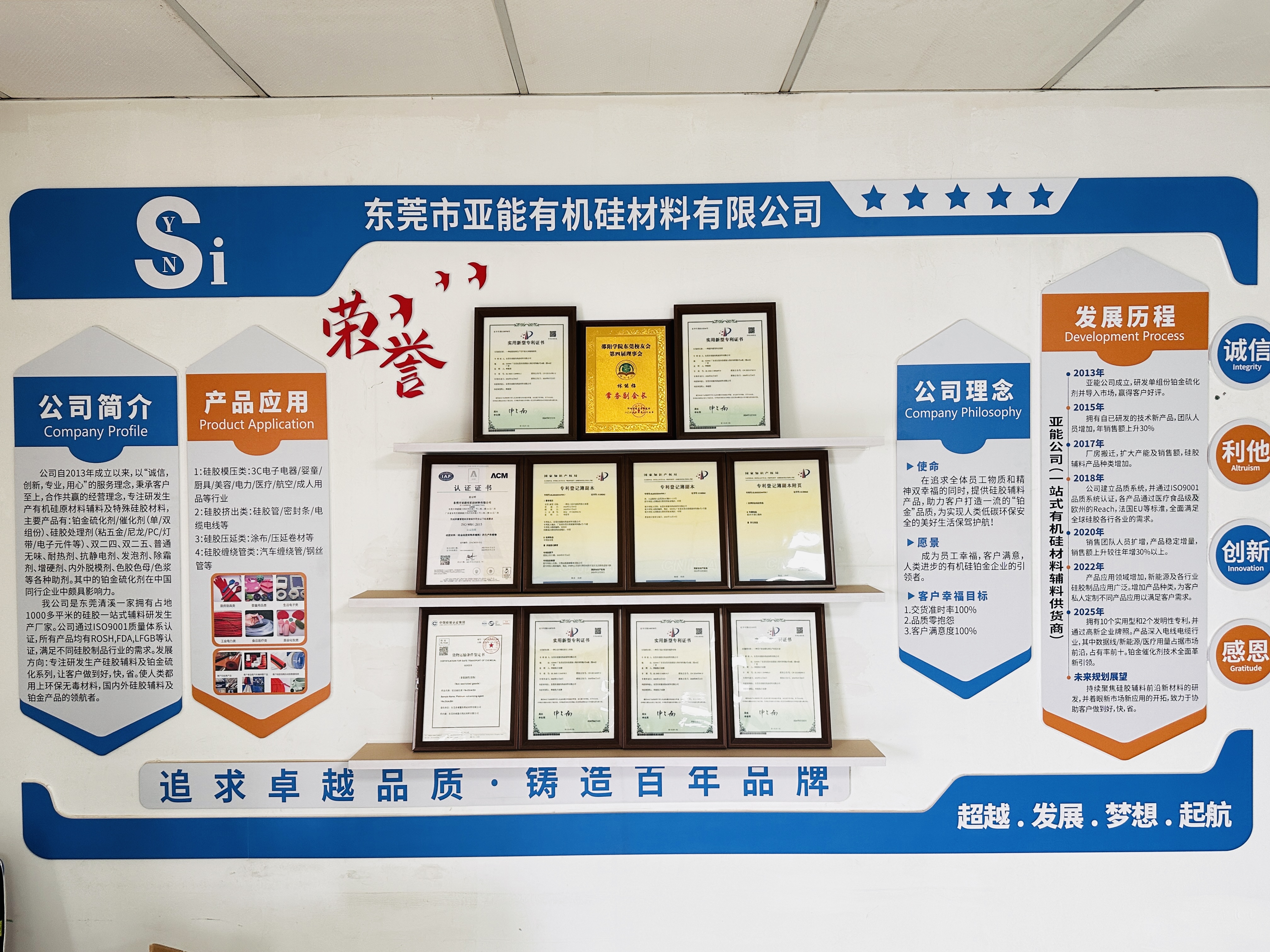 亚能有机硅通过ISO9001质量体系认证,产品获得ROSH、FDA、LFGB认证,符合环保合规要求。公司拥有1000平米研发生产基地,具备从研发到生产的一站式服务能力。预计2025年将拥有10个实用型专项和2个发明性专项,并计划通过高新企业认定。