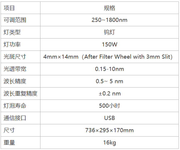 从硬件参数来看,BRS-8001 搭载 150W 钨灯,灯泡使用寿命达 500 小时,在持续实验中能保持稳定的光功率输出;光谱带宽可在 0.15-10nm 之间调节,波长重复精度达到 ±0.2nm,在精密光谱测试中能保障数据的一致性;4mm×14mm 的光斑尺寸(滤光片轮 + 3mm 狭缝后),适配多数光电检测设备的接收端规格。此外,设备采用 USB 通信接口,搭配配套的控制和数据采集软件,实现实验过程中的波长调节、数据记录一体化,简化操作流程。